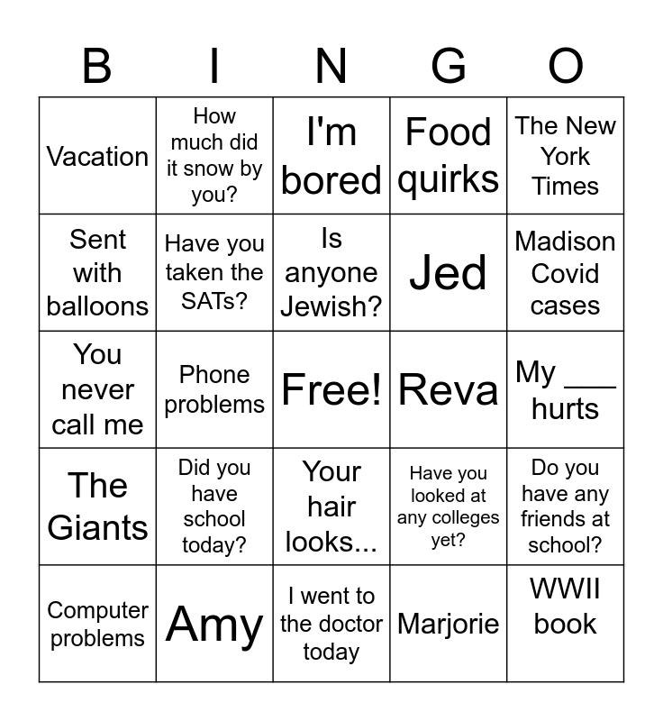 This bingo card has a free space and 24 words: Did you have school today?, Amy, Is anyone Jewish?, Computer problems, The New York Times, Vacation, Sent with balloons, How much did it snow by you?, Reva, Your hair looks..., Jed, You never call me, Have you looked at any colleges yet?, Do you have any friends at school?, Have you taken the SATs?, Marjorie, My ___ hurts, I'm bored, Madison Covid cases, Phone problems, WWII book, The Giants, Food quirks and I went to the doctor today.