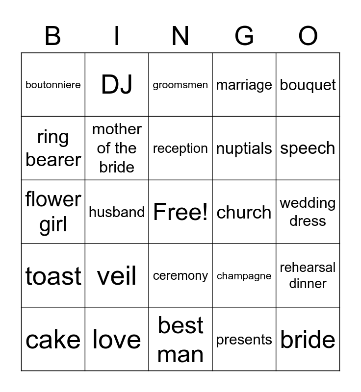 This bingo card has a free space and 45 words: groom, bride, flowers, cake, bridal shower, presents, groomsmen, ring, bouquet, love, marriage, church, ceremony, veil, maids of honour, best man, honeymoon, flower girl, first dance, speech, DJ, bridesmaids, love is sweet, boutonniere, bustle, wedding dress, celebration, corsage, champagne, toast, vows, rehearsal dinner, cocktails, photographer, i do, husband, wife forever, she said yes, fiance, reception, ring bearer, nuptials, tie the knot, mother of the bride and father of the bride.
