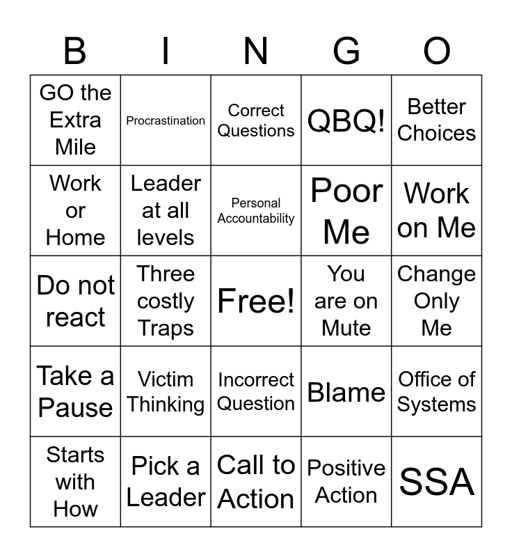 This bingo card has a free space and 24 words: Victim Thinking, Pick a Leader, Personal Accountability, Starts with How, Better Choices, GO the Extra Mile, Work or Home, Procrastination, You are on Mute, Incorrect Question, Poor Me, Do not react, Blame, Office of Systems, Leader at all levels, Positive Action, Change Only Me, Correct Questions, Work on Me, Three costly Traps, SSA, Take a Pause, QBQ! and Call to Action.