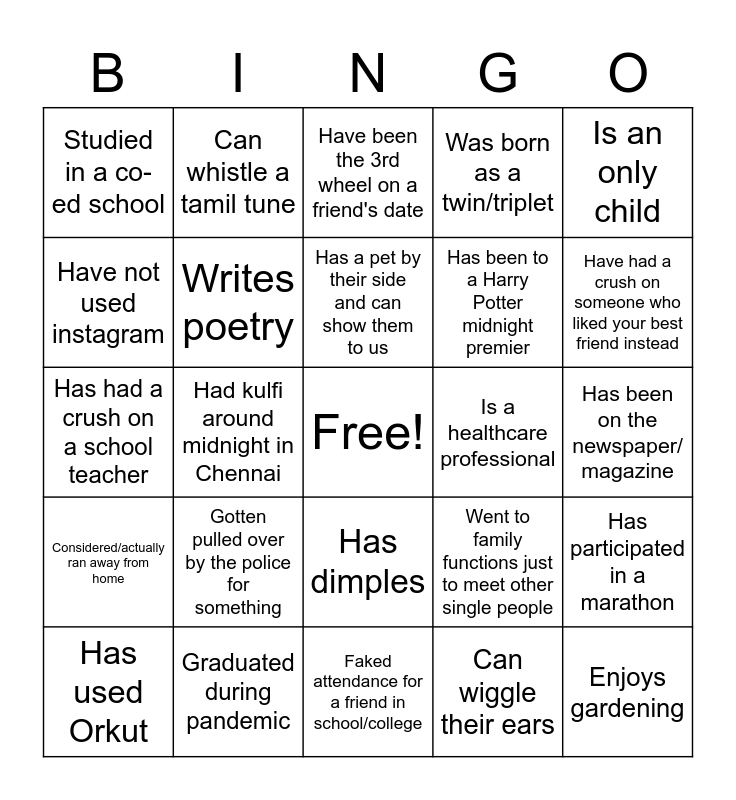This bingo card has a free space and 85 words: Has gone sky diving, While on a date, my parents called, Have been the 3rd wheel on a friend's date, My crush is at this event, Works for Big tech company, Has at least one tattoo, Enjoys working out, Have been on a blind date, have been stood up by someone on a date, You like someone in Subtle Tamil Dating group, Prefers staying home over going out, Been to a first day, first show Thalaivar movie, Writes poetry, Is a healthcare professional, Knows how to swim, Studied in a co-ed school, Has used Orkut, Have not used instagram, Has seen Jameen Kottai, Learned carnatic music, Has at one point had a actor/actress as their fb profile picture, Has been to a Harry Potter midnight premier, Enjoys gardening, Loves long drives with friends, Had kulfi around midnight in Chennai, Knows the lyrics to the theme music of Kolangal, Been kicked out of a club or bar, Has been in a dance group in college, Owns a motorcycle, Tried sambar vadai in Saravana Bhavan, Gotten pulled over by the police for something, Has travelled in public transportation without a ticket, Was in a relationship during high school, Has had a crush on a school teacher, Participated in a school sports team, Skipped class and went out with friends, Faked attendance for a friend in school/college, Has had been to your crush's wedding, Considered/actually ran away from home, Have had a crush on someone who liked your best friend instead, Ate puliodharai on road trips with the family, Have set up a friend on a date with another friend, Written a love letter for someone, Have been romantically rejected, Have rejected someone romantically, Have had your parents pick up the phone when your crush called, Have been caught with a crush by your parents' friends or neighbors, Has cooked a nice dinner for a crush/date, Gone to the movies just to make out with or be with your crush, Knows how to do mimcry, Can whistle a tamil tune, Has a pet by their side and can show them to us, Has been in a band/chorus group, Played kabadi with friends growing up, Is part of a local Cricket club, Is at this event because their parents want them married STAT, Graduated during pandemic, Was born as a twin/triplet, Is left handed/ambidextrous, Knows how to beat box, Has ran for student elections in college, Has acted in plays/dramas, Has a food allergy, Has broken their bone, Is over 6' for boys and and is over 5'9" for girls, Is an only child, Has travelled out of the country during the pandemic, Has participated in a marathon, Has volunteered for a cause, Has a best friend in the opposite gender, but has been misunderstood as a couple, Owns a business, Is a nurse, Is currently in school for a PhD, Has flown a plane as a pilot/co-pilot, Has been a server at a restaurant before, Has dimples, Can wiggle their ears, Has multiple instagram accounts for hobbies, Can skateboard, Has created/programmed an app for phones, Has been on the newspaper/ magazine, Has went snorkeling/scuba diving, Has been on a cruise, Went to family functions just to meet other single people and Has at least one parent that is not Tamil.