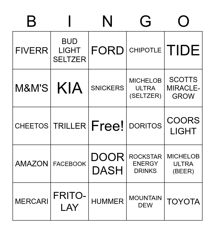 This bingo card has a free space and 36 words: BUD LIGHT, CHOBANI, AT&T, KIA, ROCKSTAR ENERGY DRINKS, AMAZON, SNICKERS, FED EX, TIDE, PRINGLES, TRILLER, CHIPOTLE, WEATHER TECH, DORITOS, SCOTTS MIRACLE-GROW, FIVERR, UBER EATS, FACEBOOK, TOYOTA, FORD, COORS LIGHT, MICHELOB ULTRA (BEER), FRITO-LAY, MERCARI, HUMMER, BUD LIGHT SELTZER, CHEETOS, TURBO TAX, MICHELOB ULTRA (SELTZER), M&M'S, VROOM, VERIZON, MOUNTAIN DEW, DOOR DASH, UPS and DELTA.