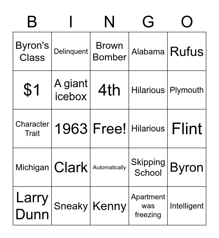 This bingo card has a free space and 25 words: Clark, Kenny, 4th, Larry Dunn, Rufus, Byron's Class, $1, Delinquent, Hilarious, Automatically, Hilarious, Character Trait, Skipping School, Byron, A giant icebox, Birmingham, Flint, Brown Bomber, Plymouth, 1963, Intelligent, Sneaky, Michigan, Alabama and Apartment was freezing.