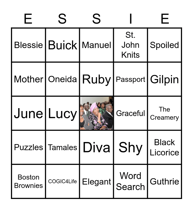 This bingo card has a free space and 29 words: Boston Brownies, January, Lucy, CNN, Blessie, Manuel, Oneida, Tamales, Graceful, COGIC4Life, The Creamery, Guthrie, Elegant, Word Search, Gilpin, Fuzzy, Diva, Puzzles, Spoiled, June, Shy, Choir, Passport, Mother, St. John Knits, Buick, Black Licorice, Ruby and Amos & Andy.