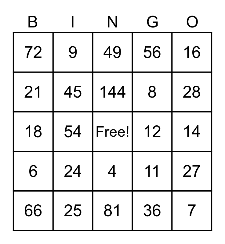 This bingo card has a free space and 24 words: 66, 24, 144, 36, 16, 72, 9, 49, 12, 14, 18, 45, 11, 27, 21, 25, 81, 56, 28, 6, 54, 4, 8 and 7.