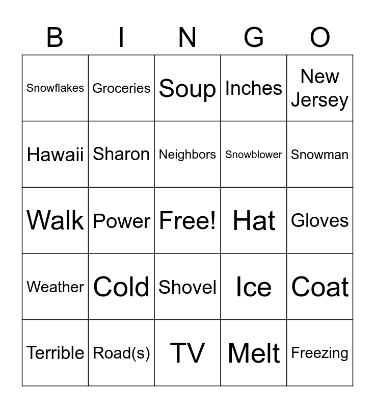 This bingo card has a free space and 24 words: Cold, Road(s), Neighbors, Terrible, New Jersey, Snowflakes, Hawaii, Groceries, Hat, Shovel, Snowblower, Walk, Ice, Coat, Sharon, Melt, Gloves, Soup, Snowman, Power, Freezing, Weather, Inches and TV.