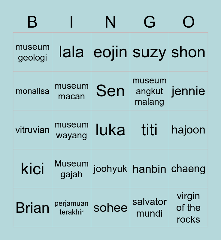 This bingo card has a free space and 24 words: Museum gajah, perjamuan terakhir, Sen, Brian, shon, museum geologi, monalisa, lala, titi, joohyuk, museum angkut malang, vitruvian, hanbin, chaeng, museum macan, salvator mundi, hajoon, eojin, jennie, museum wayang, virgin of the rocks, kici, suzy and sohee.