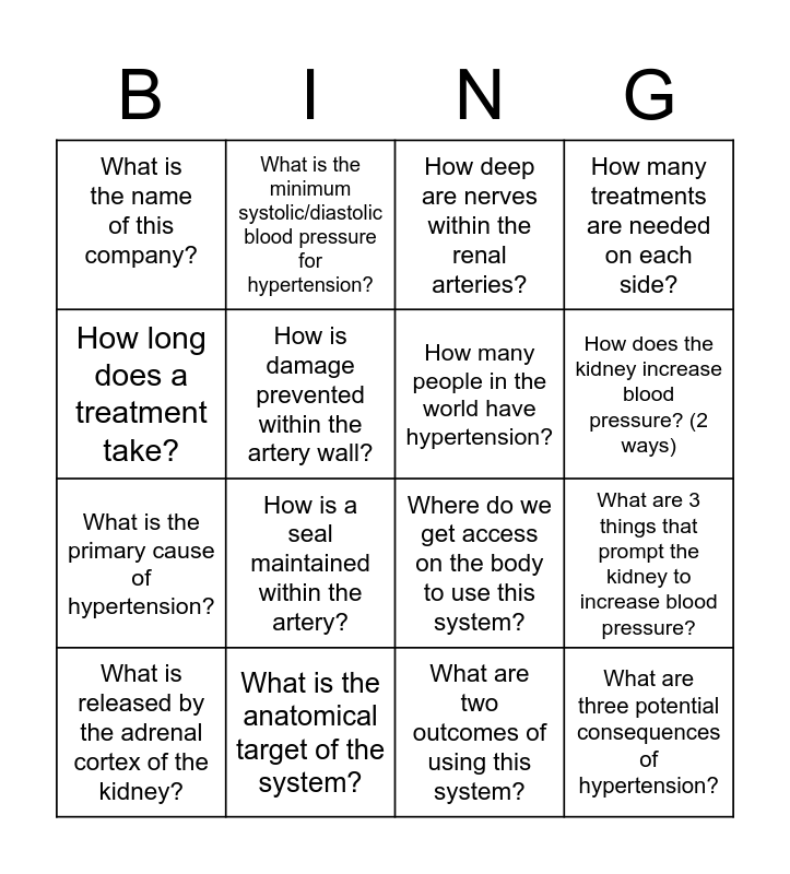 This bingo card has 24 words: What year was the system FDA approved?, What study evaluated the efficacy of this system?, How does the kidney increase blood pressure? (2 ways), How does hypertension contribute to heart failure?, How long does a treatment take?, What is the name of this company?, How is damage prevented within the artery wall?, What is the minimum systolic/diastolic blood pressure for hypertension?, What is the anatomical target of the system?, What kind of energy is used by this system?, What is the primary cause of hypertension?, Where do we get access on the body to use this system?, What happens in the blood vessels of a hypertensive patient?, What aspect of blood pressure control does this system address?, How many people in the world have hypertension?, What is the name of this product?, What are two outcomes of using this system?, How deep are nerves within the renal arteries?, How is a seal maintained within the artery?, What are 3 things that prompt the kidney to increase blood pressure?, What is released by the adrenal cortex of the kidney?, What are three potential consequences of hypertension?, How many treatments are needed on each side? and What are the two components of the system?.