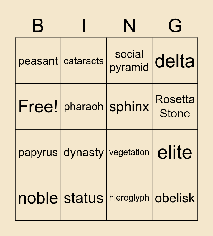 This bingo card has 16 words: status, elite, social pyramid, peasant, papyrus, cataracts, vegetation, hieroglyph, Free!, pharaoh, noble, delta, dynasty, Rosetta Stone, sphinx and obelisk.