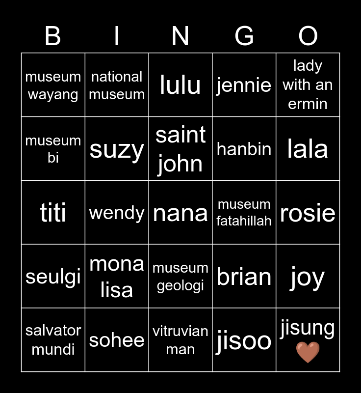This bingo card has 25 words: mona lisa, vitruvian man, saint john, salvator mundi, lady with an ermin, museum wayang, museum bi, national museum, museum fatahillah, museum geologi, hanbin, titi, brian, joy, suzy, jisung 🤎, rosie, lulu, lala, wendy, nana, sohee, seulgi, jennie and jisoo.