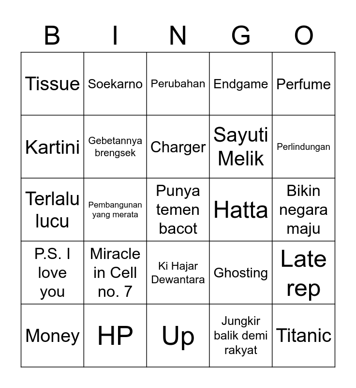 This bingo card has a free space and 24 words: Miracle in Cell no. 7, HP, Charger, Money, Perfume, Tissue, Kartini, Soekarno, Hatta, Ki Hajar Dewantara, Sayuti Melik, Terlalu lucu, Ghosting, Late rep, Gebetannya brengsek, Jungkir balik demi rakyat, Bikin negara maju, Perubahan, Perlindungan, Pembangunan yang merata, Titanic, P.S. I love you, Endgame and Up.