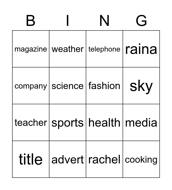 This bingo card has 20 words: media, television, telephone, newspaper, title, company, advert, magazine, teacher, weather, sports, health, science, cooking, fashion, family, sky, raina, rachel and elsa.