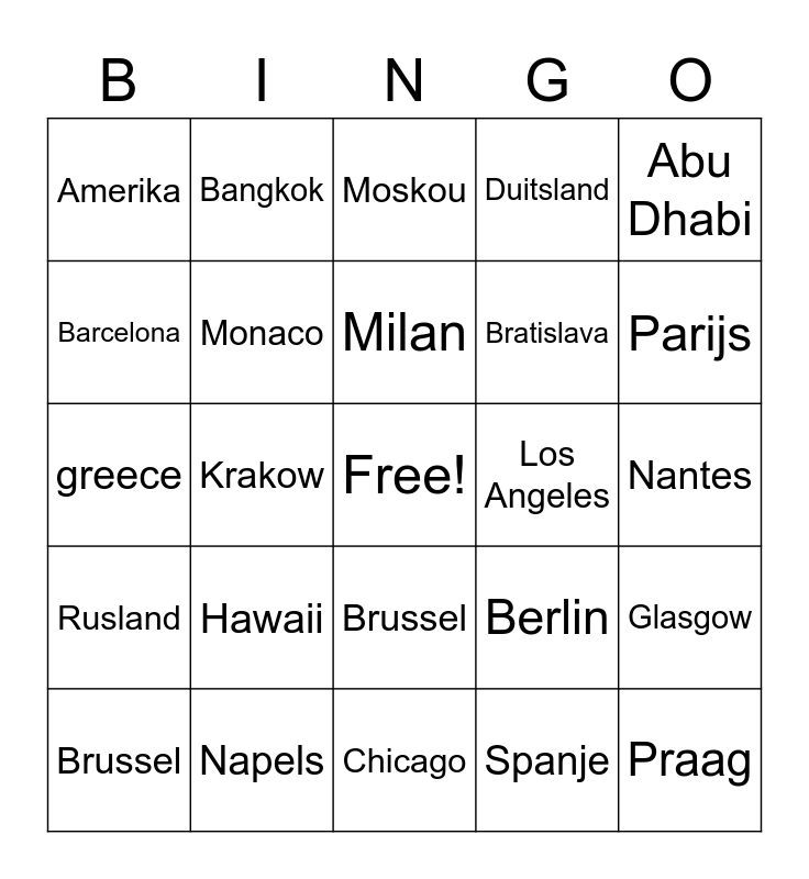 This bingo card has a free space and 88 words: Berlin, Amsterdam, Brussel, Paris, Barcelona, Sebastopol, prague, Tilburg, madrid, Valencia, Belfast, Dublin, Glasgow, Nantes, Monaco, Milan, Napels, Rome, US, France, Belgium, Italy, greece, Istanbul, Spanje, Mexico, Frankrijk, Thailand, Polen, Brazilie, Moskou, Duitsland, Rusland, China, Hawaii, Barcelona, Amerika, Nederland, England, Parijs, Krakow, Washington, London, Berlin, Los Angeles, Parijs, Oostenrijk, Zweden, Kroatie, Bratislava, Polen, Ierland, Malta, Barcelona, Reykjavik, Mexico, Rusland, Bangkok, Ecuador, Malaga/Sevilla, Salzburg, Toulouse, Galway, Istanbul, Sebastopol, Napels, Frankfurt, Monaco, Brussel, Praag, Birmingham, Belfast, Asjchabad, Abu Dhabi, Australie, India, Bali, Japan, Chicago, Rio de Janeiro, Rome, Jerusalem, South Africa, Mali, Canada, South Sudan, Mongolia and Chile.