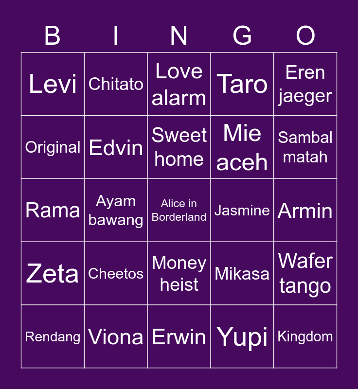 This bingo card has a free space and 24 words: Cheetos, Viona, Sweet home, Rendang, Eren jaeger, Levi, Original, Chitato, Jasmine, Money heist, Mie aceh, Rama, Mikasa, Wafer tango, Edvin, Yupi, Armin, Love alarm, Sambal matah, Ayam bawang, Kingdom, Zeta, Taro and Erwin.