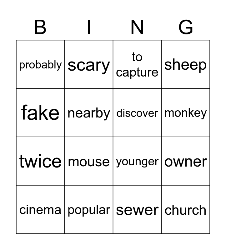 This bingo card has 24 words: clothes, place, monkey, difinitely, fake, probably, nearby, scary, popular, sick, twice, younger, to scream, bully, discover, wings, sewer, to capture, mouse, owner, cinema, church, sheep and wall.