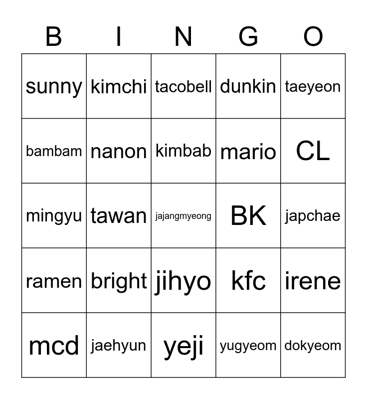 This bingo card has a free space and 24 words: bright, jaehyun, kimbab, mcd, taeyeon, sunny, bambam, kimchi, BK, jihyo, mario, mingyu, kfc, irene, nanon, yugyeom, japchae, tacobell, CL, tawan, dokyeom, ramen, dunkin and yeji.