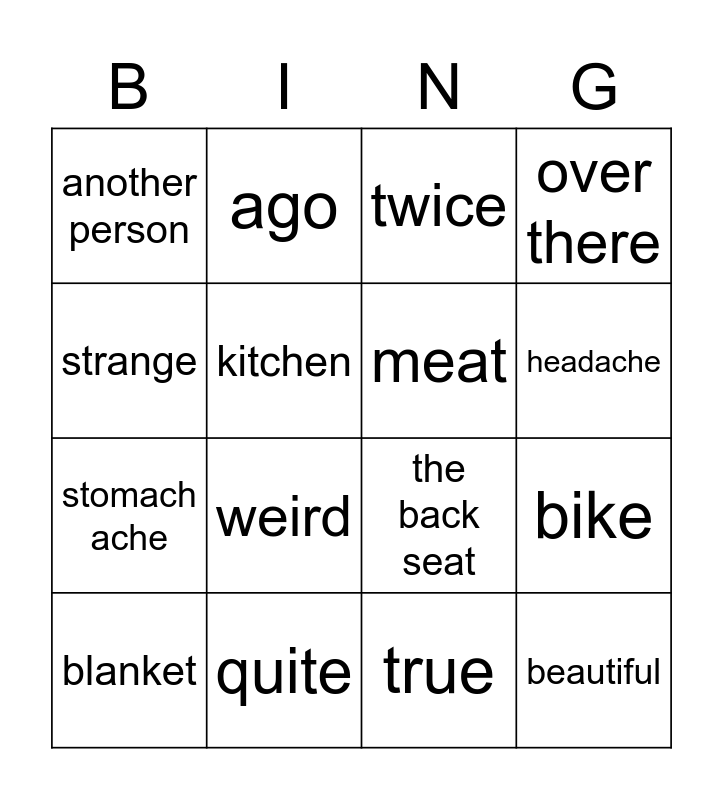 This bingo card has 24 words: funny, brains, headache, to convince, strange, another person, kitchen, ago, quite, sick, stomach ache, the back seat, country, to vanish, meat, to flush the toilet, true, twice, weird, bike, blanket, beautiful, over there and heard.