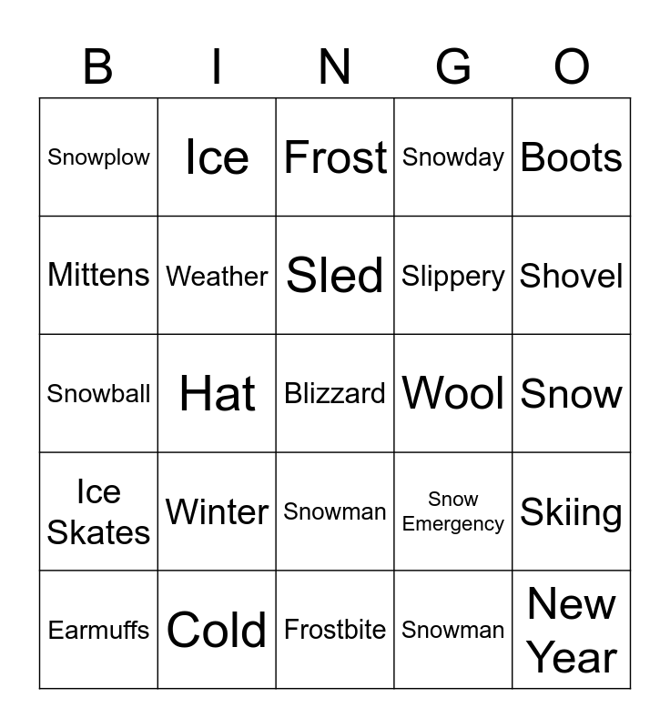 This bingo card has 26 words: Snowman, Snowman, Sled, Cold, Boots, Snowplow, Mittens, Ice, Snow, Snow Emergency, Slippery, Snowball, Skiing, Earmuffs, Hat, Blanket, Snowday, Ice Skates, Frost, Blizzard, Shovel, Frostbite, Wool, Winter, Weather and New Year.