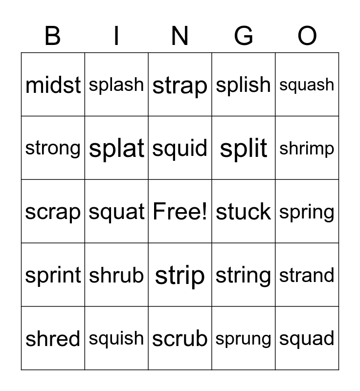 This bingo card has a free space and 27 words: string, stress, split, scrub, strong, strap, splash, sprint, stuck, strand, scrap, splish, shred, squish, shrimp, shrink, splat, squid, shrub, midst, spring, sprung, squat, squad, strip, squash and script.
