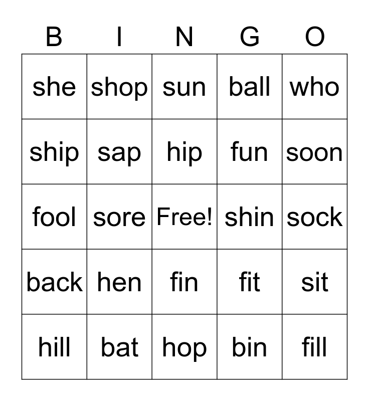 This bingo card has a free space and 25 words: hen, hop, hip, hill, who, she, ship, shop, shin, fin, fun, fool, fit, sit, sap, sack, sock, sun, soon, sore, fill, bat, back, ball and bin.