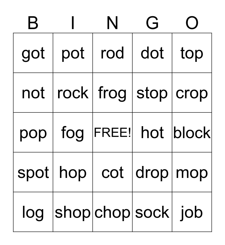 This bingo card has a free space and 24 words: hop, shop, frog, log, top, got, not, pot, hot, cot, stop, pop, drop, mop, rock, sock, block, rod, crop, fog, job, spot, dot and chop.