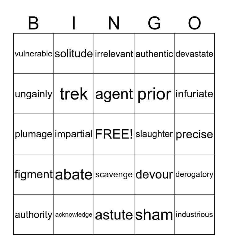 This bingo card has a free space and 24 words: abate, acknowledge, agent, authority, devastate, vulnerable, ungainly, solitude, slaughter, scavenge, prior, plumage, devour, derogatory, trek, sham, precise, irrelevant, infuriate, impartial, industrious, figment, authentic and astute.