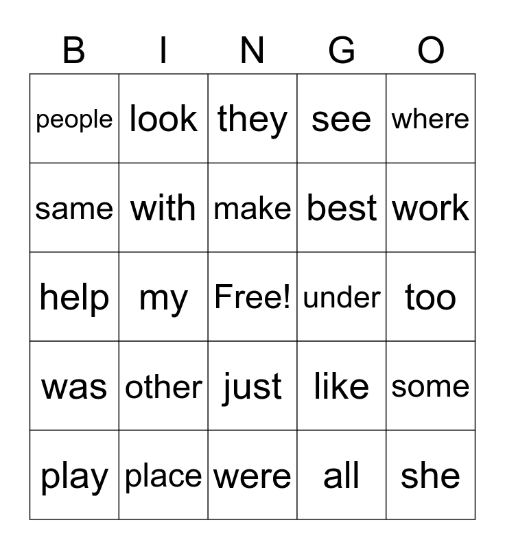 This bingo card has a free space and 24 words: other, place, make, play, where, people, same, look, under, just, best, help, like, some, with, all, too, they, work, my, she, was, see and were.