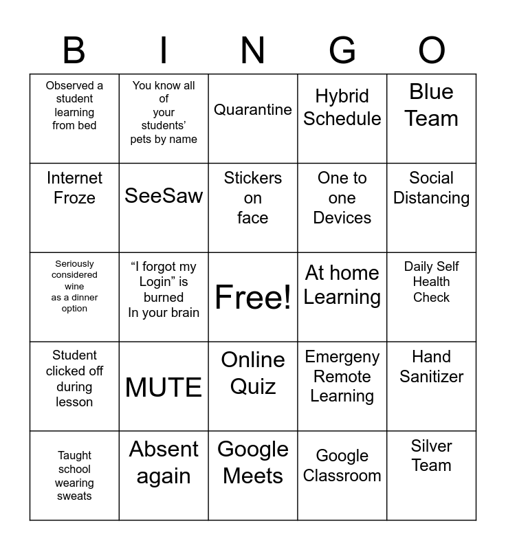 This bingo card has a free space and 24 words: Taught school wearing sweats, MUTE, Stickers on face, Google Classroom, Blue Team, Observed a student learning from bed, You know all of your students’ pets by name, Quarantine, At home Learning, Daily Self Health Check, Seriously considered wine as a dinner option, SeeSaw, Emergeny Remote Learning, Hand Sanitizer, Internet Froze, Absent again, Google Meets, Hybrid Schedule, Social Distancing, Student clicked off during lesson, “I forgot my Login” is burned In your brain, Online Quiz, One to one Devices and Silver Team.