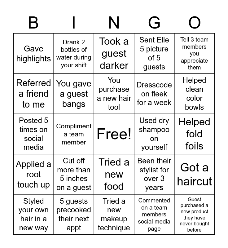 This bingo card has a free space and 24 words: Cut off more than 5 inches on a guest, 5 guests precooked their next appt, You purchase a new hair tool, Styled your own hair in a new way, Tell 3 team members you appreciate them, Gave highlights, Referred a friend to me, Drank 2 bottles of water during your shift, Used dry shampoo on yourself, Tried a new food, Dresscode on fleek for a week, Posted 5 times on social media, Been their stylist for over 3 years, Got a haircut, You gave a guest bangs, Commented on a team members social media page, Helped fold foils, Took a guest darker, Helped clean color bowls, Compliment a team member, Guest purchased a new product they have never bought before, Applied a root touch up, Sent Elle 5 picture of 5 guests and Tried a new makeup technique.