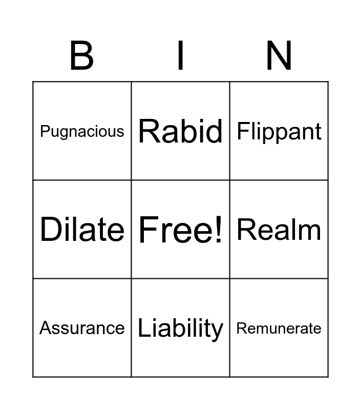 This bingo card has a free space and 20 words: Dwindle, Rejuvenate, Flippant, Immunity, Venture, Remunerate, Asylum, Pugnacious, Institute, Rabid, Sterling, Dross, Realm, Preposterous, Assurance, Warp, Liability, Dilate, Sparse and Console.