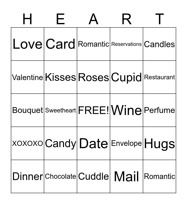 This bingo card has a free space and 24 words: Candy, Chocolate, Roses, Dinner, Candles, Love, Valentine, Card, Wine, Date, Cupid, Bouquet, Envelope, Hugs, Kisses, Mail, Perfume, Romantic, Restaurant, Sweetheart, Romantic, XOXOXO, Reservations and Cuddle.