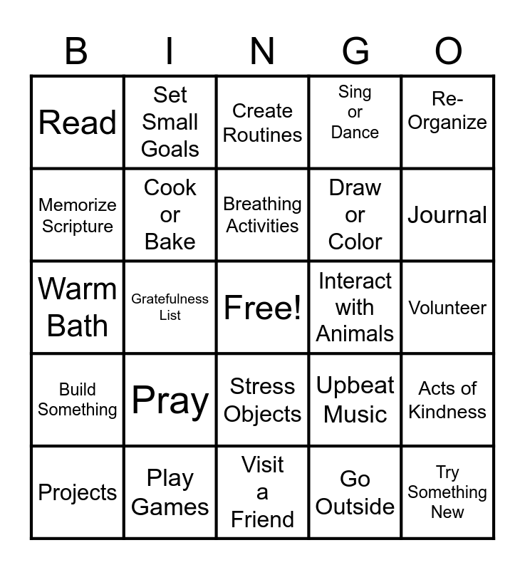 This bingo card has a free space and 24 words: Pray, Play Games, Breathing Activities, Projects, Re-Organize, Read, Memorize Scripture, Set Small Goals, Interact with Animals, Stress Objects, Draw or Color, Warm Bath, Upbeat Music, Acts of Kindness, Cook or Bake, Go Outside, Volunteer, Create Routines, Journal, Gratefulness List, Try Something New, Build Something, Sing or Dance and Visit a Friend.