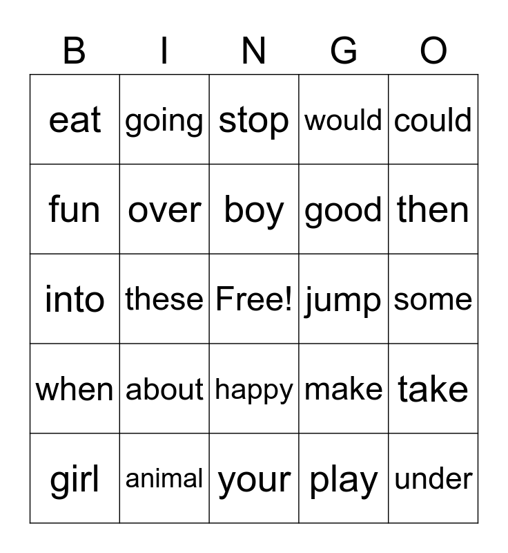 This bingo card has a free space and 24 words: about, animal, boy, girl, could, eat, fun, going, jump, happy, good, into, make, take, over, play, some, stop, then, these, under, when, would and your.