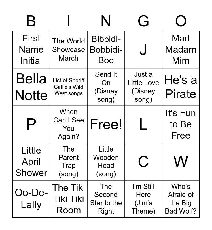 This bingo card has a free space and 160 words: Alice (Avril Lavigne song), All for Love (song), All Is Found, Almost Home (Mariah Carey song), Atlantis (Donovan song), B, Baby Mine (song), Back to Life (Alicia Keys song), The Ballad of Davy Crockett, The Beddy Bye Blues, Bella Notte, The Best Time of Your Life, Bibbidi-Bobbidi-Boo, Breakaway (Kelly Clarkson song), C, Candle on the Water, Chikai (Utada Hikaru song), D, Daring to Dance, Derezzed, Don't Mess with Me, A Dream Is a Wish Your Heart Makes, E, Edge of the Edge of the Sea, Everybody Wants to Be a Cat, F, First Name Initial, Flower of the Universe, Fly to Your Heart, Following the Leader, For Now, For Always, G, Gift of a Friend, Give a Little Whistle, Go the Distance, Goodbye So Soon, The Gospel Truth (song), Grim Grinning Ghosts, H, Hawaiian Roller Coaster Ride, He's a Pirate, Hi-Diddle-Dee-Dee, Hikari (Utada Hikaru song), How Far I'll Go, I, I Am Moana (Song of the Ancestors), I Believe (DJ Khaled song), I Put a Spell on You, I Remember (Disney song), I Still Believe (Disney song), I Still Believe (Hayden Panettiere song), I Won't Say (I'm in Love), I'll Always Be Irish, I'm Still Here (Jim's Theme), I've Got No Strings, If You Can Dream, Immortals (song), In the Lobster Mobster Mob, It's a Small World (After All), It's a Small World (song), It's Fun to Be Free, J, Jo Jo the Dog Faced Boy (song), Jump to the Rhythm, Juntos (Together), Just a Little Love (Disney song), Just Like Fire, Just Like Me (Disney song), Just One Mistake, L, Lavender's Blue, Let Me Be Good to You (Disney song), Let's Get Together (Hayley Mills song), Little April Shower, Little Patch of Heaven, Little Wonders, Little Wooden Head (song), Look Through My Eyes, Love (Disney song), Love Is a Song, M, Mad Madam Mim, Made of Stone (Disney song), Make Me Look Good, Mickey Mouse March, Minnie's Yoo-Hoo, Miracles Happen (When You Believe), Monster (Disney song), My Funny Friend and Me, N, Never Give Up (Disney song), Never Smile at a Crocodile, The Next Right Thing (Disney song), No Way Out (Phil Collins song), Not in Nottingham, O, O Dio Mio, Old Yeller (song), Once Upon a Dream (Sleeping Beauty song), Once Upon a Time in New York City, One Last Hope, Oo-De-Lally, P, The Parent Trap (song), Passion (Utada Hikaru song), Perfect Isn't Easy, Pineapple Princess, Pink Elephants on Parade, R, Remembering You (song), S, Sacrifice (song), The Second Star to the Right, Secrets (OneRepublic song), Send It On (Disney song), List of Sheriff Callie's Wild West songs, Shiny (Moana song), Shooting Star (Disney song), Show Yourself (Disney song), Sing a New Song, Sing, Sweet Nightingale, So This is Love (Cinderella song), The Sound of Laughter (song), The Spectrum Song, A Star Is Born (Hercules song), Streets of Gold (song), Stupid Cupid, Sugar Rush (AKB48 song), T, Tall Paul, There You'll Be, There's a Great Big Beautiful Tomorrow, This Is Halloween, The Tiki Tiki Tiki Room, Train of Love (Paul Anka song), Trees (poem), Try Everything, W, We Could Be Kings, A Whale of a Tale, What Made the Red Man Red?, When Can I See You Again?, When I See an Elephant Fly, When You Wish Upon a Star, Where the Dream Takes You, Who's Afraid of the Big Bad Wolf?, Why Should I Worry?, The World Showcase March, The World's Greatest Criminal Mind, Y, Yo Ho (A Pirate's Life for Me), Yodel-Adle-Eedle-Idle-Oo, (You Ain't) Home On The Range, You're Welcome (Moana song), You've Got to Be You, Your Crowning Glory, Z, Zero (Imagine Dragons song), Zero To Hero (Hercules's Song) and Zip-a-Dee-Doo-Dah.