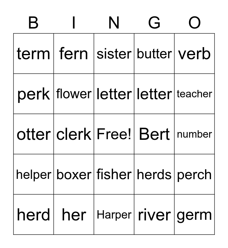 This bingo card has a free space and 26 words: fisher, river, letter, her, verb, term, perk, fern, number, herds, letter, otter, perch, herd, clerk, after, butter, helper, sister, germ, teacher, Harper, Bert, boxer, flower and whisper.
