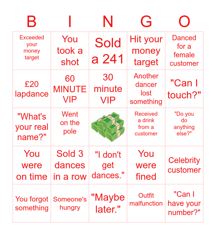 This bingo card has a free space and 24 words: Sold 3 dances in a row, Someone's hungry, 30 minute VIP, You forgot something, Danced for a female customer, Exceeded your money target, £20 lapdance, You took a shot, Received a drink from a customer, "I don't get dances.", Another dancer lost something, "What's your real name?", You were fined, Celebrity customer, 60 MINUTE VIP, Outfit malfunction, "Do you do anything else?", Sold a 241, "Can I touch?", Went on the pole, "Can I have your number?", You were on time, Hit your money target and "Maybe later.".