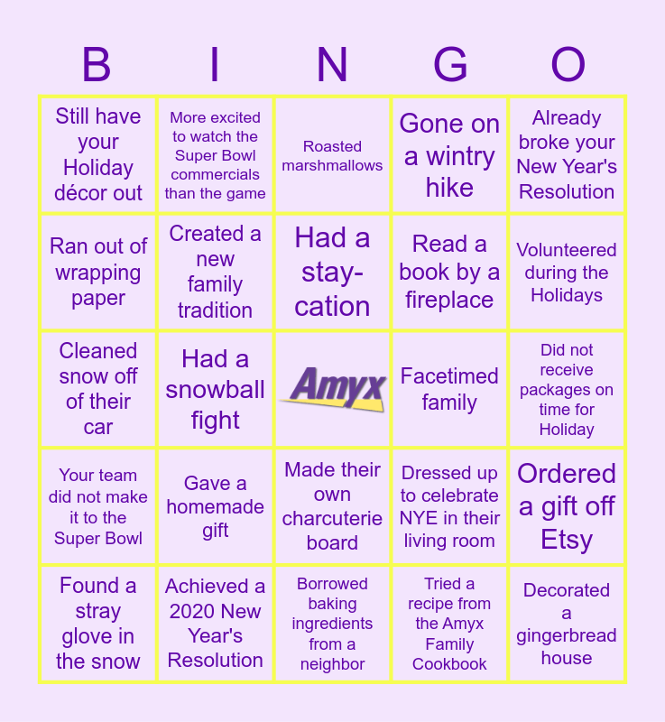This bingo card has a free space and 38 words: Put up Holiday décor in October/Early November, Canceled trip to visit family, Gifted face masks or hand sanitizer, Created a new family tradition, Ordered a gift off Etsy, Gave a homemade gift, Had a stay-cation, Made a snowman, Already broke your New Year's Resolution, Read a book by a fireplace, Had a snowball fight, Gone on a wintry hike, Decorated a gingerbread house, Did not receive packages on time for Holiday, Ran out of wrapping paper, Your team did not make it to the Super Bowl, Saw a holiday light show, Roasted marshmallows, Watched football, Facetimed family, Still have your Holiday décor out, Achieved a 2020 New Year's Resolution, Volunteered during the Holidays, Found a stray glove in the snow, Took a road trip, Borrowed baking ingredients from a neighbor, Finished a show series, Returned a gift that you received, 2020 calendar is still up, Your team is playing in the Super Bowl, Received a Amyx Holiday blanket, Made their own charcuterie board, Tried a recipe from the Amyx Family Cookbook, More excited to watch the Super Bowl commercials than the game, Submitted a recipe for the Amyx Family Cookbook, Dressed up to celebrate NYE in their living room, Cleaned snow off of their car and Ordered Girl Scout Cookies.