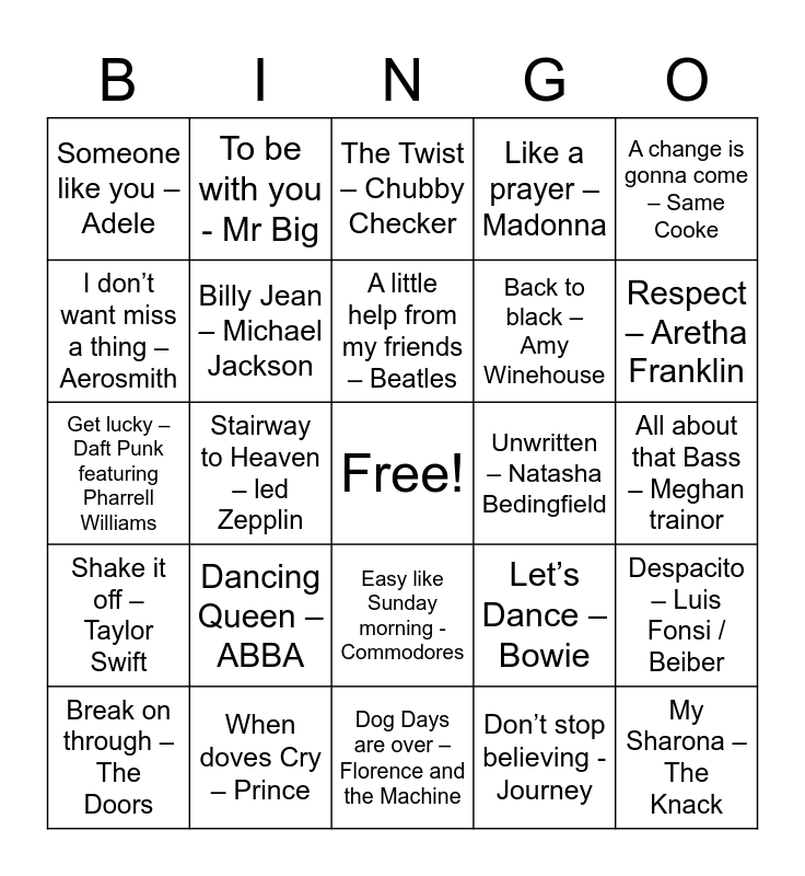This bingo card has a free space and 25 words: Dancing Queen – ABBA, Dog Days are over – Florence and the Machine, A little help from my friends – Beatles, Break on through – The Doors, A change is gonna come – Same Cooke, Someone like you – Adele, I don’t want miss a thing – Aerosmith, To be with you - Mr Big, Unwritten – Natasha Bedingfield, Easy like Sunday morning - Commodores, Back to black – Amy Winehouse, Get lucky – Daft Punk featuring Pharrell Williams, Let’s Dance – Bowie, Despacito – Luis Fonsi / Beiber, Billy Jean – Michael Jackson, Total Eclipse of the Heart –, All about that Bass – Meghan trainor, The Twist – Chubby Checker, Respect – Aretha Franklin, Stairway to Heaven – led Zepplin, My Sharona – The Knack, When doves Cry – Prince, Shake it off – Taylor Swift, Like a prayer – Madonna and Don’t stop believing - Journey.