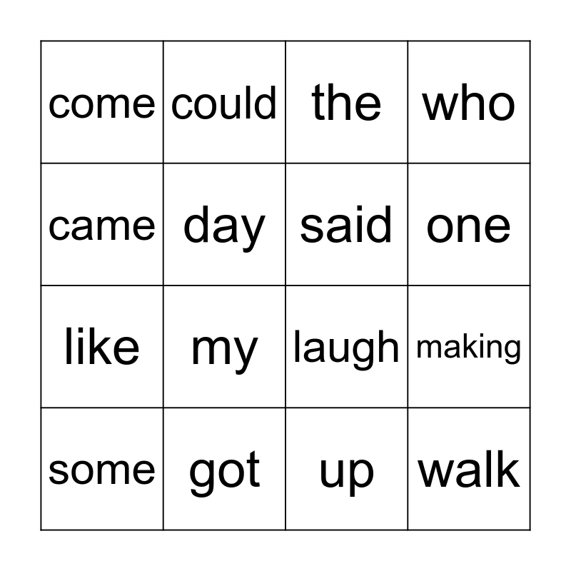This bingo card has 17 words: up, some, the, come, my, who, making, said, one, day, got, laugh, came, could, like, not and walk.