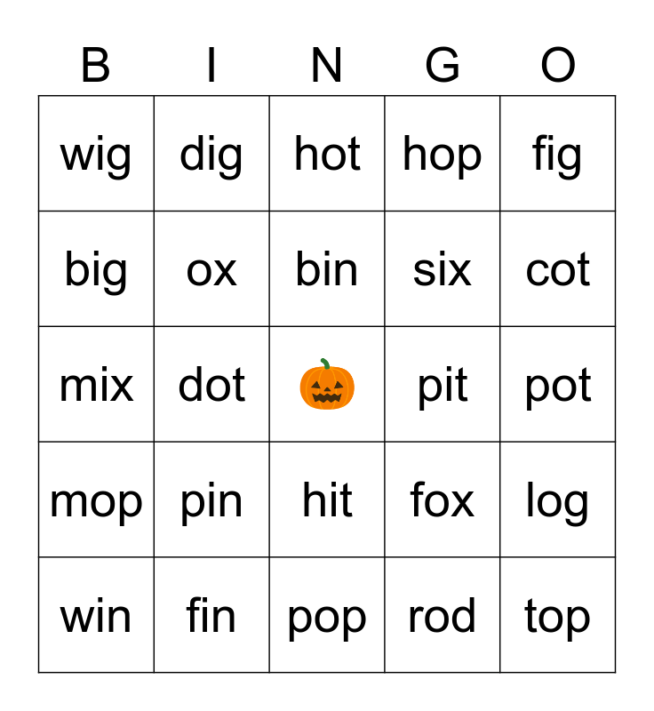 This bingo card has a free space and 24 words: pin, fin, bin, win, fig, wig, big, dig, pit, hit, six, mix, fox, log, ox, rod, pot, hot, cot, dot, top, mop, hop and pop.