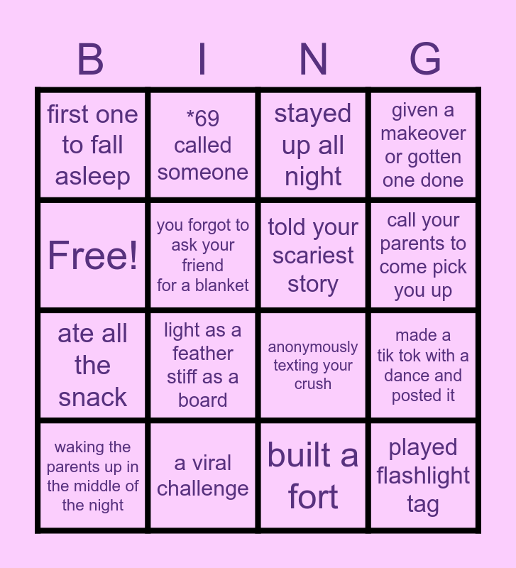 This bingo card has 16 words: a viral challenge, made a tik tok with a dance and posted it, stayed up all night, first one to fall asleep, ate all the snack, *69 called someone, anonymously texting your crush, built a fort, Free!, you forgot to ask your friend for a blanket, waking the parents up in the middle of the night, given a makeover or gotten one done, light as a feather stiff as a board, call your parents to come pick you up, told your scariest story and played flashlight tag.