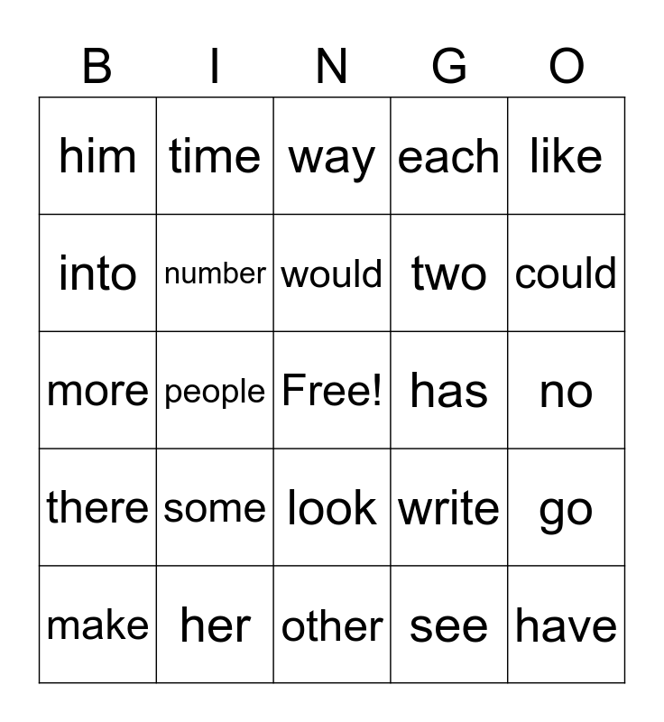 This bingo card has a free space and 24 words: some, her, would, make, like, him, into, time, has, look, two, more, write, go, number, see, no, way, could, people, have, there, each and other.