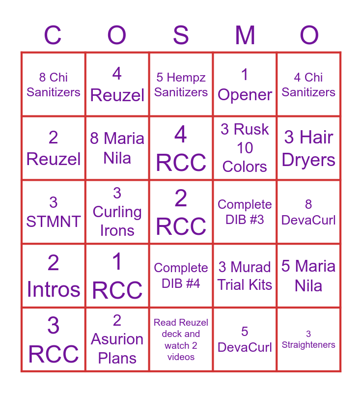 This bingo card has a free space and 24 words: 1 RCC, 2 Asurion Plans, 4 RCC, 3 RCC, 4 Chi Sanitizers, 8 Chi Sanitizers, 2 Reuzel, 4 Reuzel, Complete DIB #3, Complete DIB #4, 3 Rusk 10 Colors, 3 STMNT, 3 Murad Trial Kits, 5 Maria Nila, 8 Maria Nila, 5 DevaCurl, 8 DevaCurl, 5 Hempz Sanitizers, 3 Hair Dryers, 3 Curling Irons, 3 Straighteners, 2 Intros, 1 Opener and Read Reuzel deck and watch 2 videos.