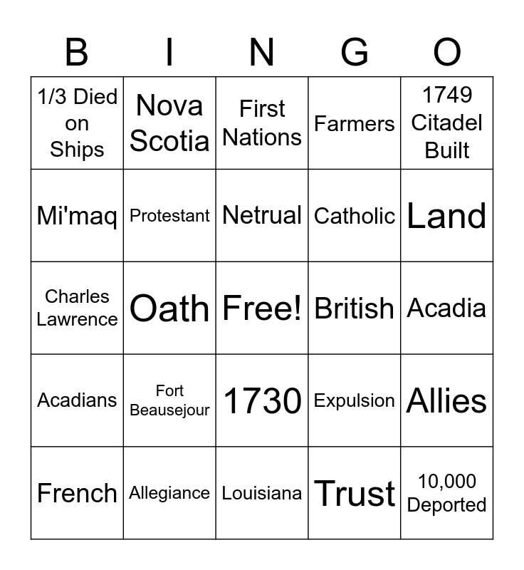 This bingo card has a free space and 24 words: Fort Beausejour, Allegiance, Netrual, French, 1749 Citadel Built, 1/3 Died on Ships, Mi'maq, Nova Scotia, British, 1730, Catholic, Charles Lawrence, Expulsion, Allies, Protestant, Trust, Acadia, First Nations, Land, Oath, 10,000 Deported, Acadians, Farmers and Louisiana.