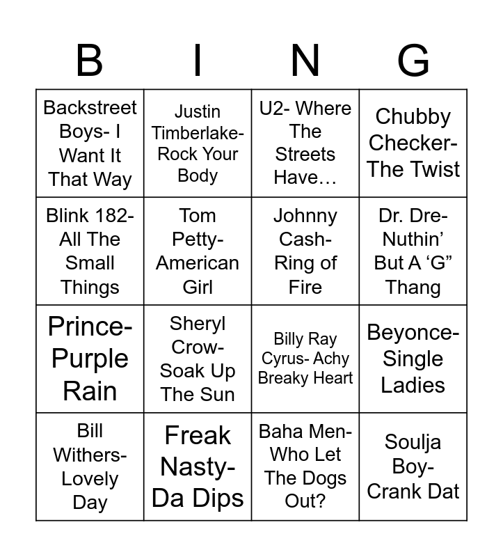 This bingo card has 27 words: Free!, Bruno Mars- Just The Way You Are, Prince- Purple Rain, Katy Perry- Roar, Tom Petty- American Girl, U2- Where The Streets Have…, Justin Timberlake- Rock Your Body, Soulja Boy- Crank Dat, Freak Nasty- Da Dips, Jimmy Buffett- Fins, Billy Ray Cyrus- Achy Breaky Heart, Chubby Checker- The Twist, Carole King- I Feel The Earth Move, Rick James- Super Freak, Sheryl Crow- Soak Up The Sun, Big Boi- The Way You Move, Johnny Cash- Ring of Fire, Dr. Dre- Nuthin’ But A ‘G” Thang, B-52’s- Love Shack, Backstreet Boys- I Want It That Way, Baha Men- Who Let The Dogs Out?, Bee Gees- Stayin’ Alive, Beyonce- Single Ladies, Bill Withers- Lovely Day, Billie Eilish- Bad Guy, Blink 182- All The Small Things and Blondie- Heart of Glass.