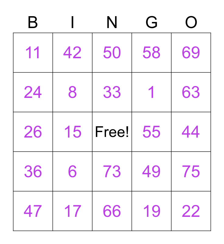 This bingo card has a free space and 24 words: 6, 17, 33, 47, 69, 11, 24, 42, 55, 73, 1, 26, 49, 75, 8, 19, 44, 50, 63, 15, 22, 36, 58 and 66.