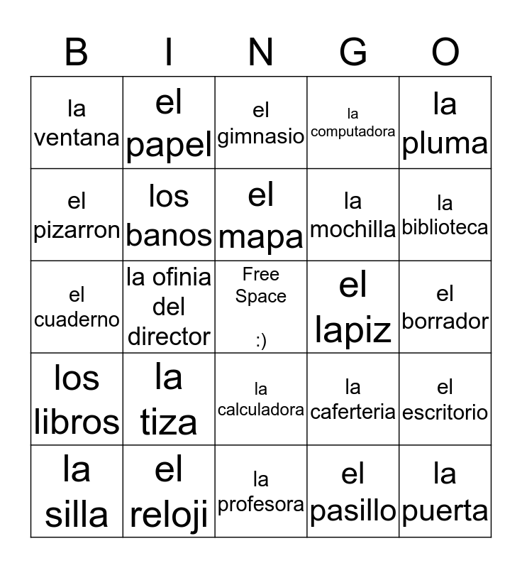 This bingo card has a free space and 24 words: la tiza, el reloji, el mapa, la silla, la pluma, la ventana, el pizarron, el papel, el lapiz, la calculadora, la mochilla, el cuaderno, la caferteria, el escritorio, los banos, el pasillo, el borrador, el gimnasio, la biblioteca, la ofinia del director, la puerta, los libros, la computadora and la profesora.