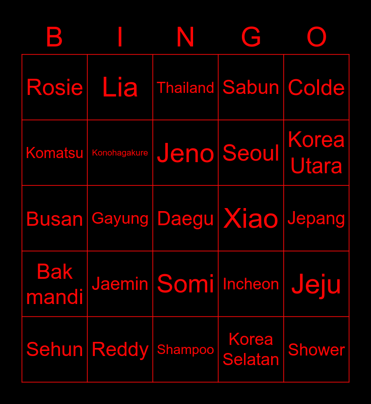 This bingo card has a free space and 24 words: Jaemin, Reddy, Jeno, Sehun, Colde, Rosie, Komatsu, Lia, Xiao, Somi, Seoul, Busan, Incheon, Jeju, Konohagakure, Korea Selatan, Jepang, Thailand, Korea Utara, Gayung, Shower, Bak mandi, Sabun and Shampoo.