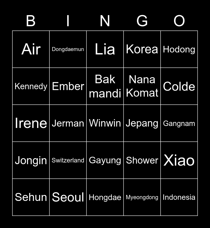 This bingo card has a free space and 24 words: Sehun, Switzerland, Bak mandi, Myeongdong, Hodong, Air, Dongdaemun, Lia, Jepang, Gangnam, Irene, Ember, Shower, Xiao, Kennedy, Seoul, Hongdae, Korea, Colde, Jongin, Jerman, Gayung, Nana Komat and Indonesia.