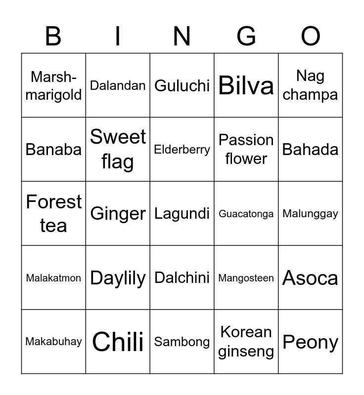 This bingo card has 25 words: Daylily, Sambong, Elderberry, Makabuhay, Nag champa, Marsh-marigold, Banaba, Dalandan, Guacatonga, Dalchini, Passion flower, Forest tea, Mangosteen, Asoca, Sweet flag, Peony, Malunggay, Guluchi, Bahada, Ginger, Lagundi, Chili, Malakatmon, Bilva and Korean ginseng.
