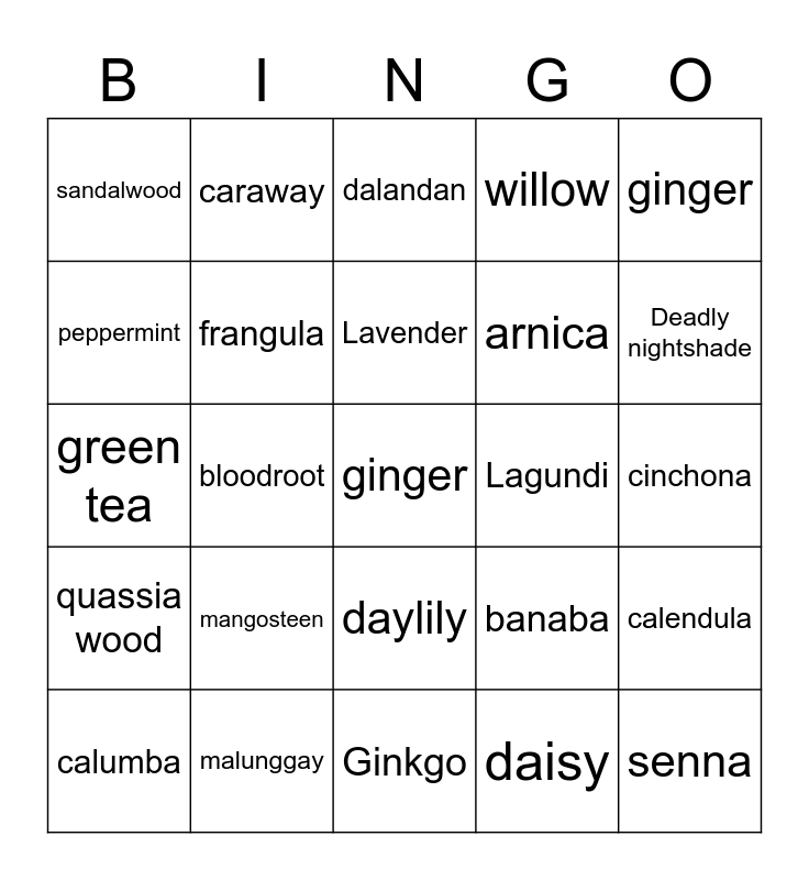 This bingo card has 25 words: mangosteen, Ginkgo, Lavender, calumba, ginger, sandalwood, peppermint, caraway, Lagundi, daylily, arnica, green tea, banaba, calendula, frangula, senna, cinchona, dalandan, Deadly nightshade, bloodroot, ginger, malunggay, quassia wood, willow and daisy.
